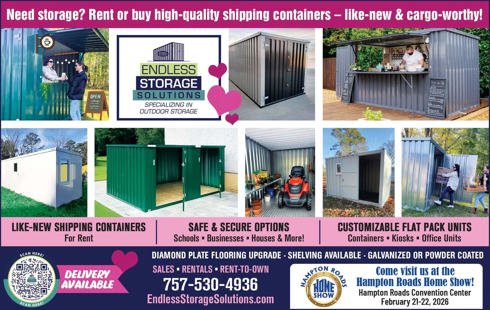 We offer like new (used once) shipping containers for rent in Northeastern North Carolina in two sizes:
